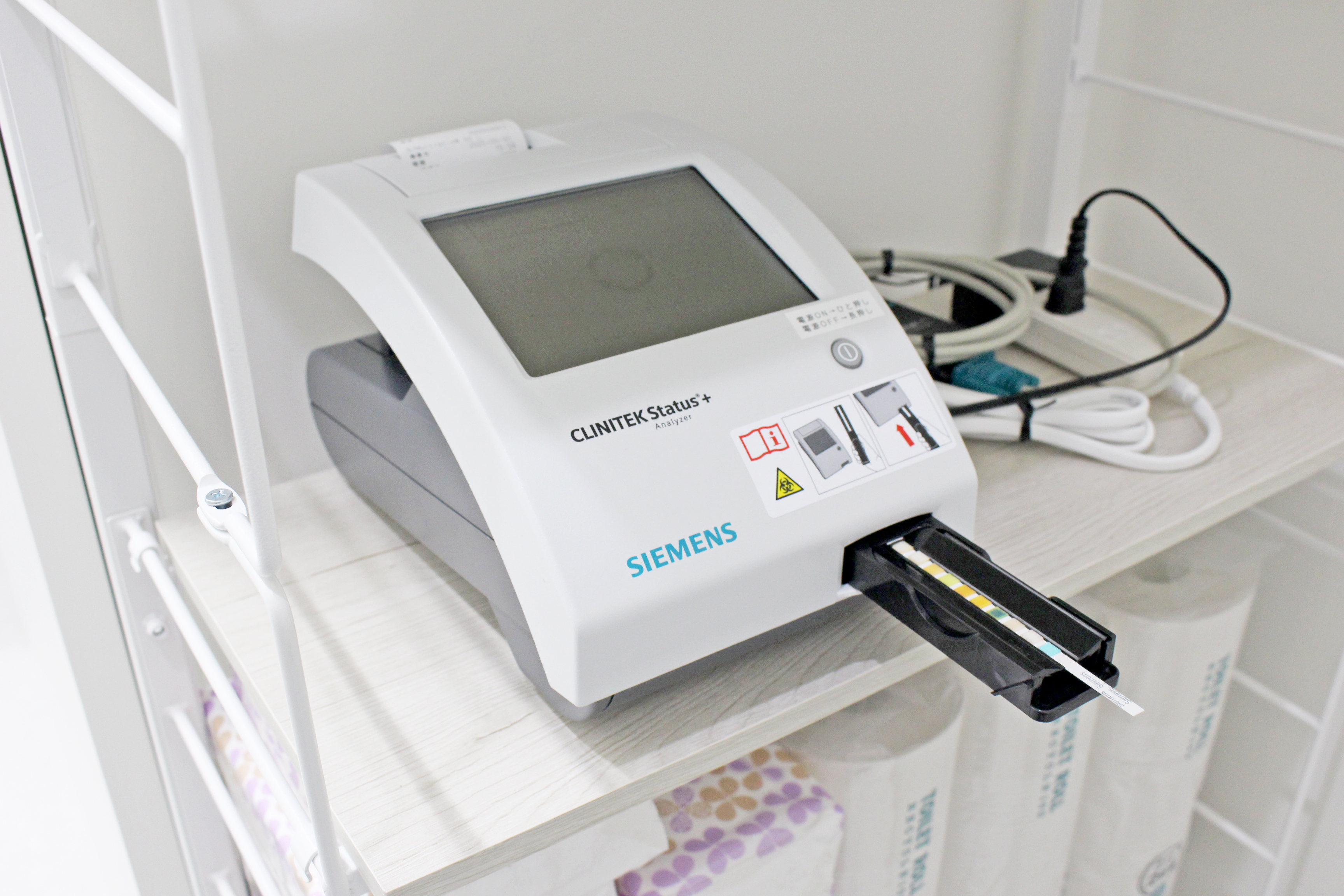 尿中のブドウ糖、蛋白質・潜血・pH(ペーハー)・ケトン体・比重・白血球などの尿検査がすぐにできます。